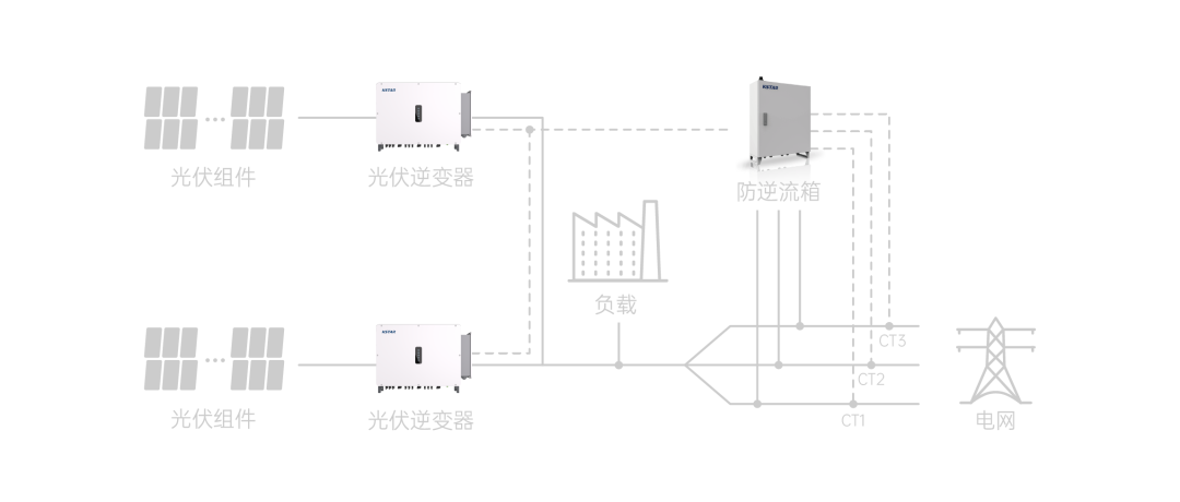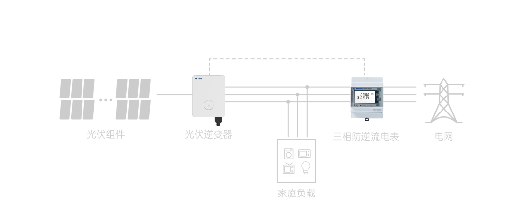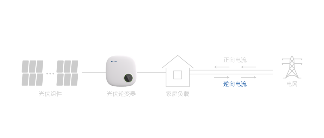 在光伏系統中,光伏組件輸出直流電通過逆變器,轉換為交流電供負載使用;當光伏系統的發電功率大于負載功率時,由于負載無法全部消納光伏發出的電,多余的電力就會反方向流入電網,產生“逆流”。而具備防逆流功能的光伏系統,可以在發電功率大于負載功率時,及時降低逆變器輸出功率,以降低系統整體發電功率,確保光伏發出的電僅供負載使用,避免多余的電力流向電網。